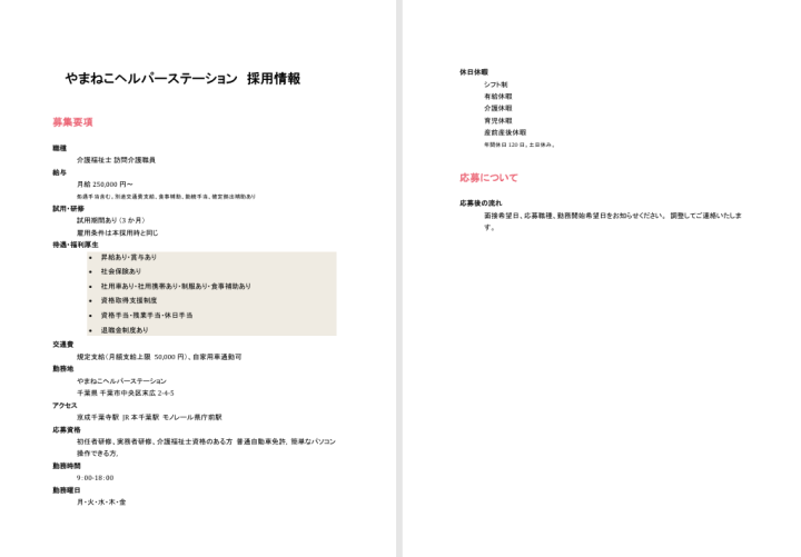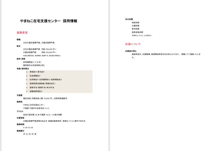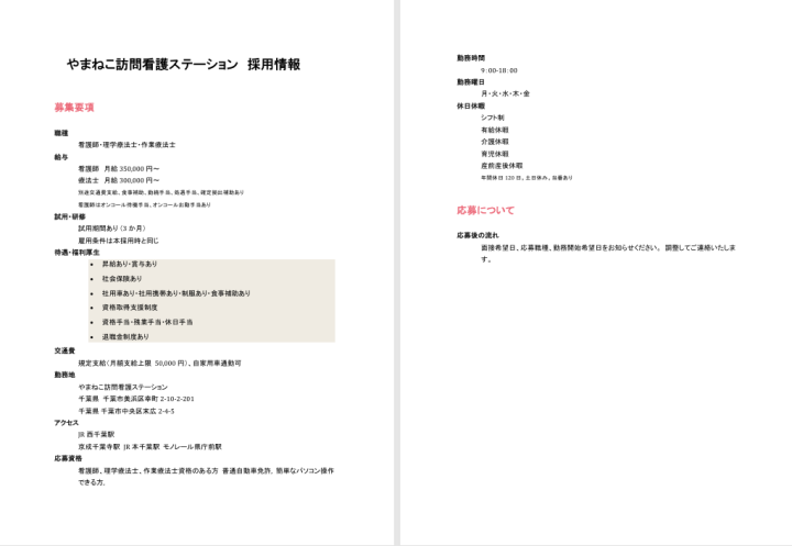 採用情報 やまねこ各事業所では、利用者様も一緒に働く仲間にも癒しを与えられるような職員を随時募集しております。 ※直接応募(ホームページからの問い合わせ等)の方を優先させて頂きます。やまねこ訪問看護ステーション・看護師・理学療法士・作業療法士やまねこ在宅支援センター・主任介護支援専門員・介護支援専門員やまねこヘルパーステーション・サービス提供責任者・介護福祉士・実務者研修修了者・初任者研修修了者 訪問看護・リハビリ 居宅介護支援 訪問介護